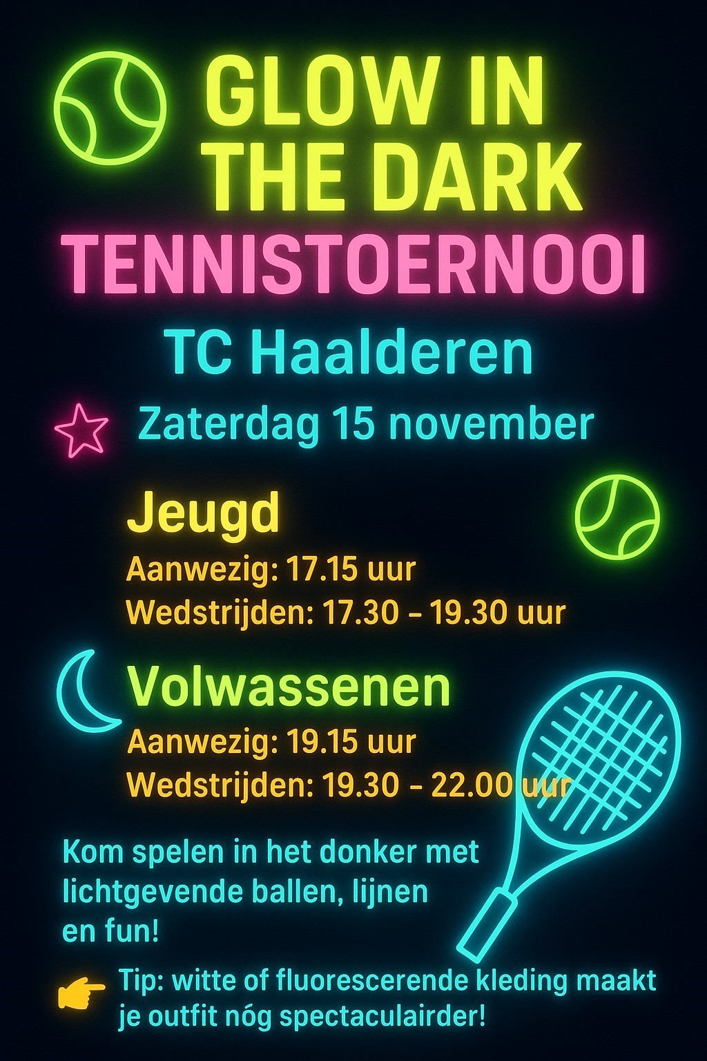 Save the Date: 15 november 2025 Glow in the dark Tennistoernooi voor de Jeugd en Volwassenen