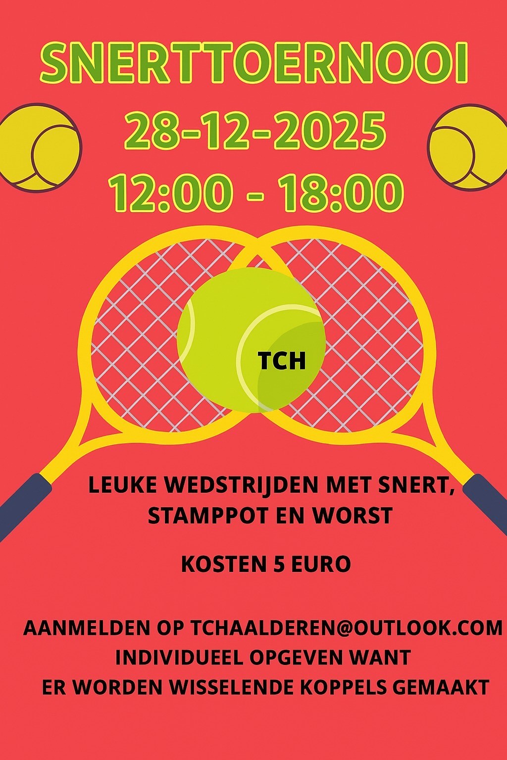 Heb je zin om het jaar sportief en knus af te sluiten? Doe dan mee aan ons Snerttoernooi. We kijken ernaar uit om samen een heerlijke, winterse tennisdag te beleven! 🎾❄️