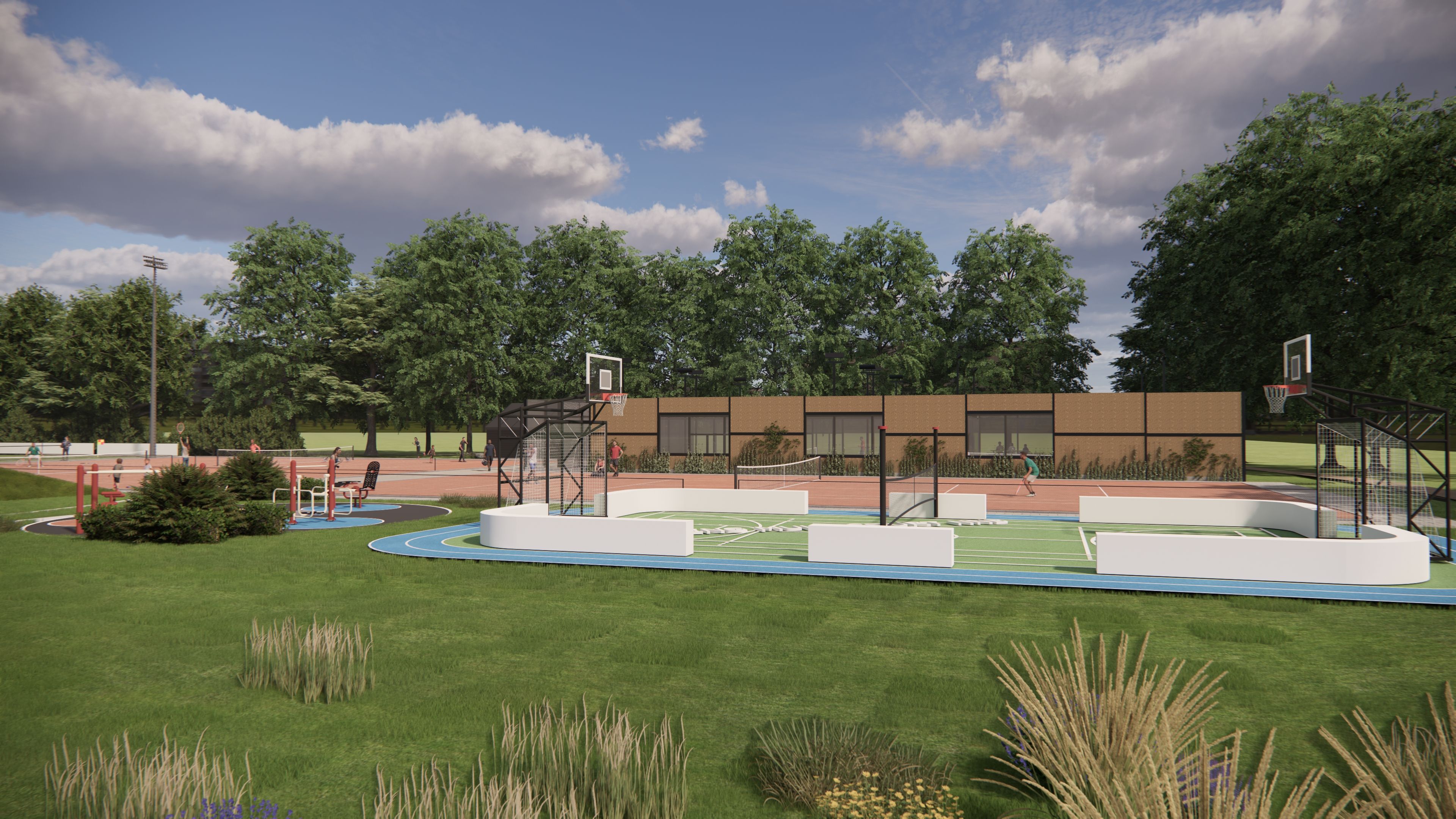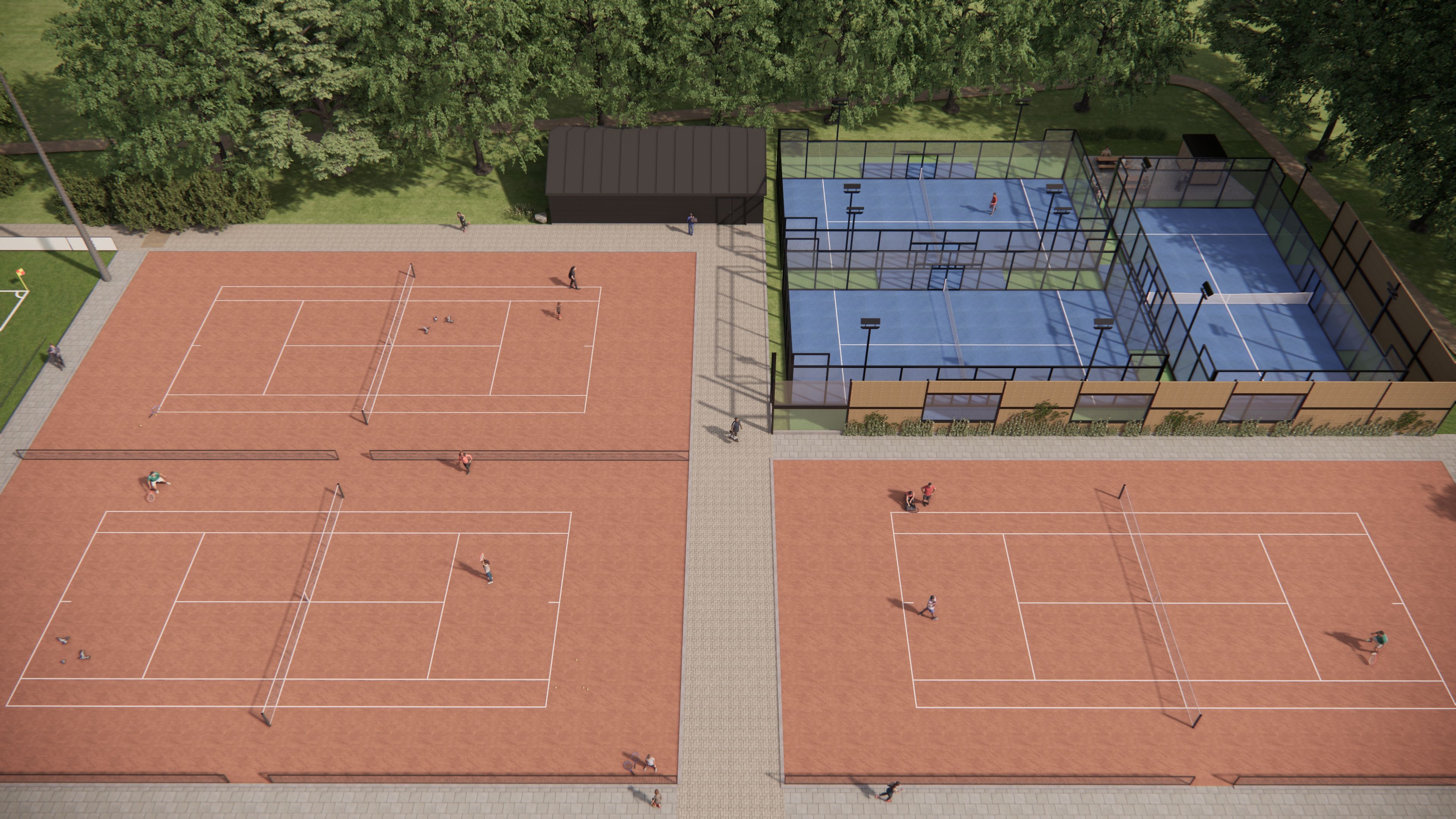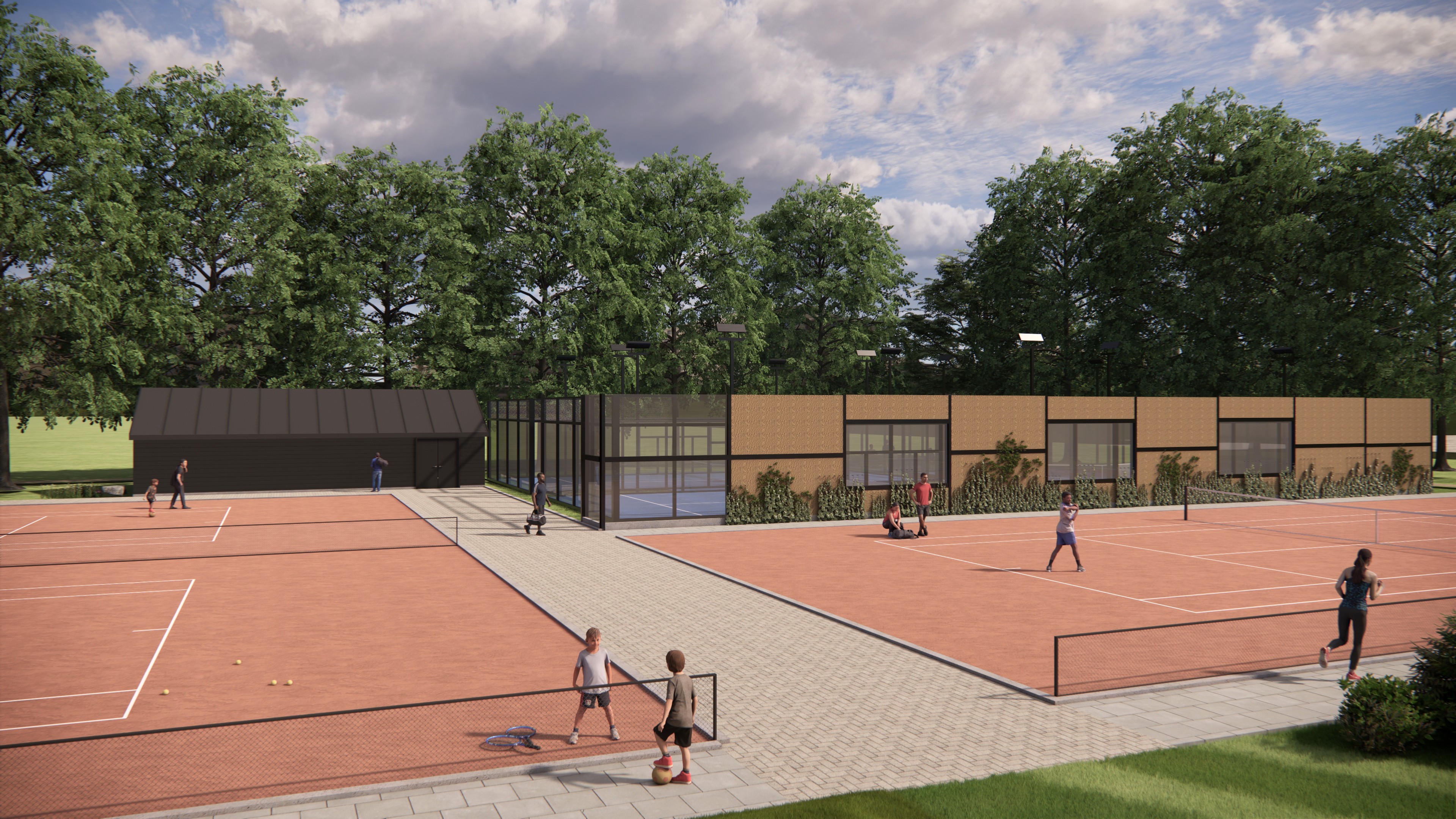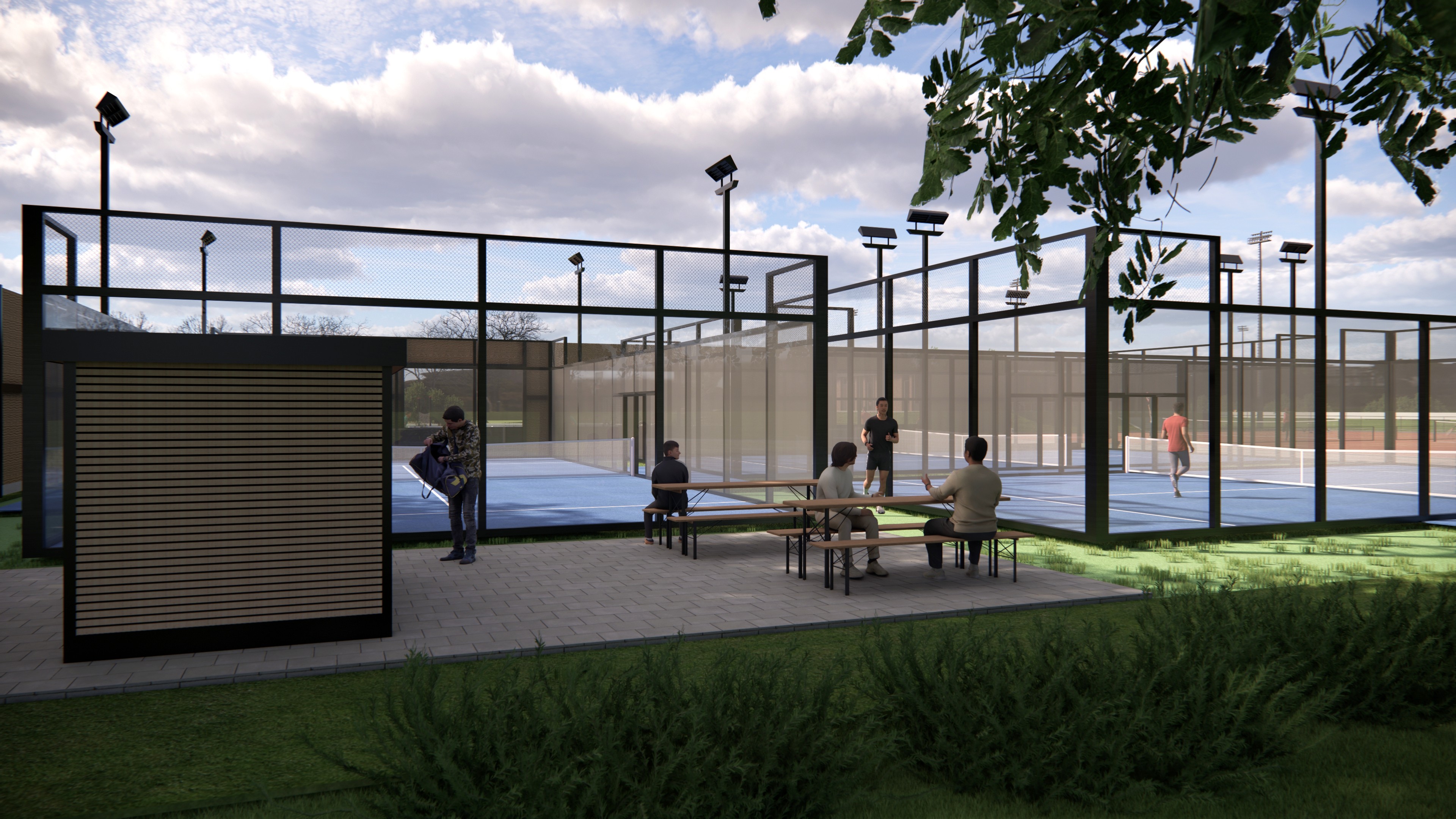 Foto: Impressie CONCEPT buitenterrein daarin de drie padelbanen geprojecteerd.